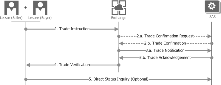 A spectrum trade begins when two parties, a lessor (seller) and a lessee (buyer), agree to conduct a leasing arrangement facilitated through the Exchange. The spectrum trade transaction starts as the Exchange first validates the requesting parties’ certification status and also confirms that the trade, if completed, will not violate a spectrum aggregation limit. Prima facie valid trades are then submitted for automated review and confirmation to the SAS.